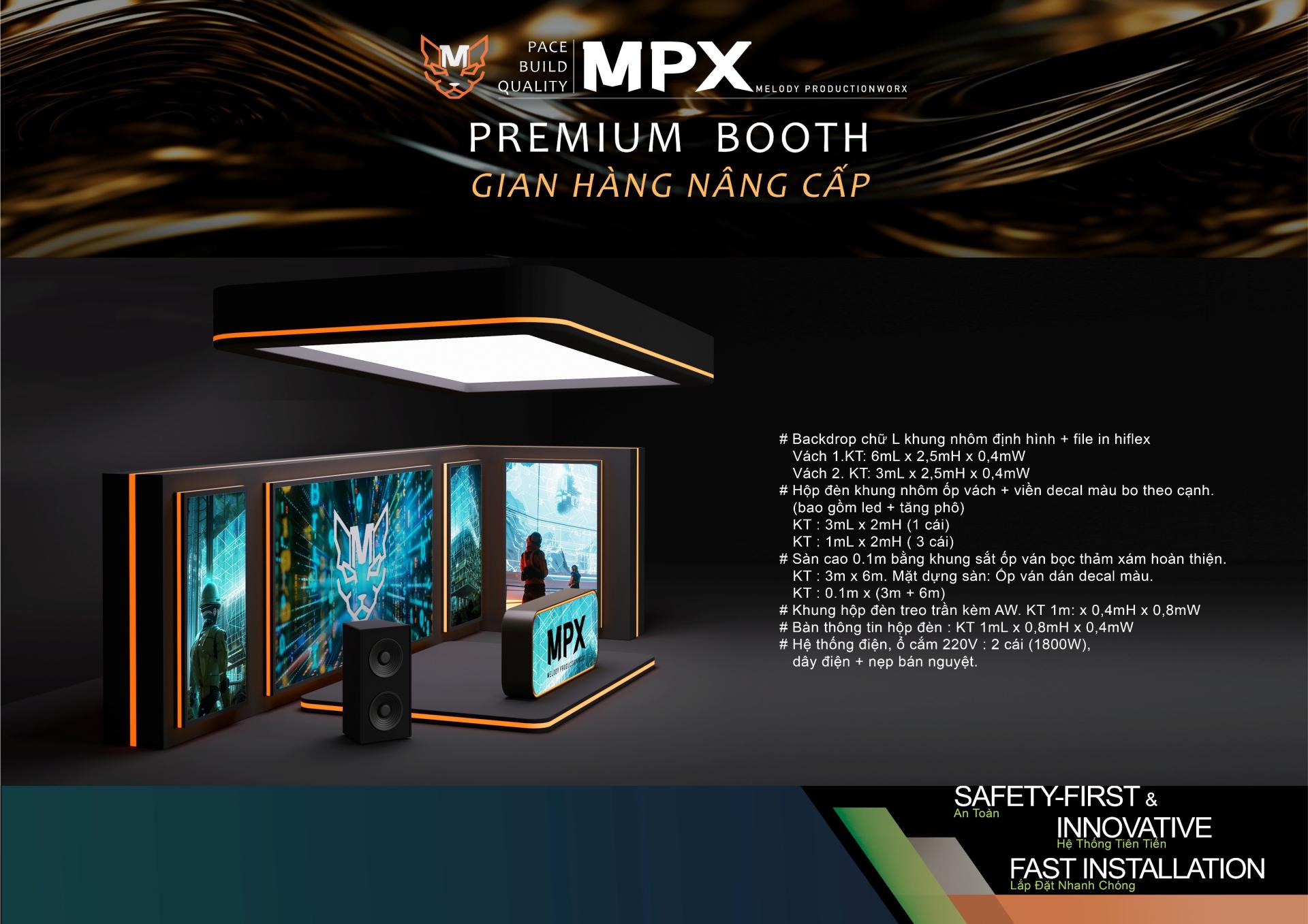 Mẫu booth chữ L nổi bật với hệ thống hộp đèn LED viền cam ấn tượng, kết hợp trần treo hộp đèn và mặt sàn giật cấp – là lựa chọn lý tưởng cho các thương hiệu cần gây ấn tượng mạnh trong các sự kiện công nghệ, truyền thông và giải trí.